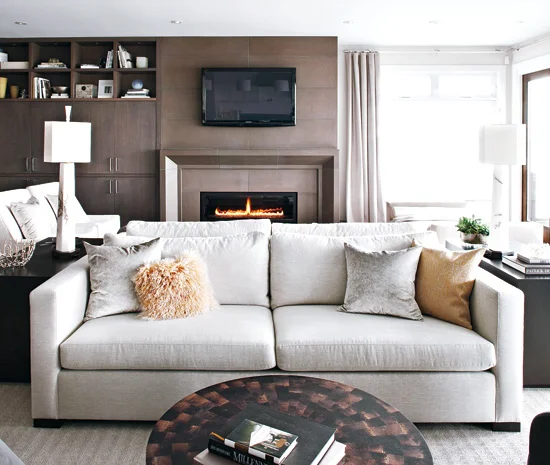 6. Include plenty of seating If your living room, has panoramic views of the ocean, you can organize several seating areas that offer places to read and relax, entertain, have dinner while watching a movie, or just gaze outside at your gorgeous view. You can create a dramatic feature wall with a gorgeous concrete fireplace or a floor to ceiling set of build in shelves that work well with the cabinetry of your kitchen. Perhaps you can utilize some dark stain on the shelves and cabinets and accent these with Ivory and heather - grey upholstered pieces balancing the rooms dark furnishings and carpentry.